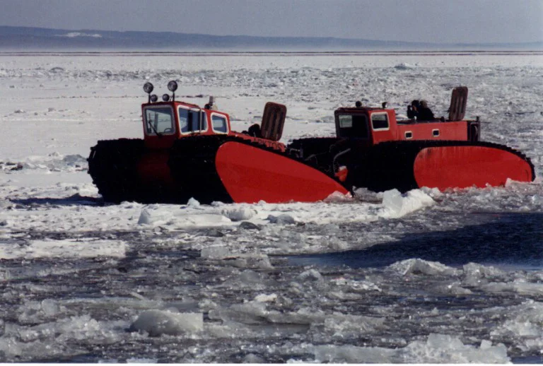 Although Esprit de Corps readers may now be familiar with this unique vehicle, the fact is that it remains an incredibly impressive and innovative machine. It is basically a go-anywhere articulated tracked vehicle that can conquer rough terrain, ice and water. The Arktos craft is massive in scope, being able to transport up to 52 people. It is particularly well suited for operations in the Arctic as its forward compartment can use its tracks to actually claw its way out of flowing water onto ice, while using the rear portion to provide buoyancy. This incredible machine is also heat resistant, which opens up a whole new world of possibilities such as fighting fires in Alberta’s oil patch.