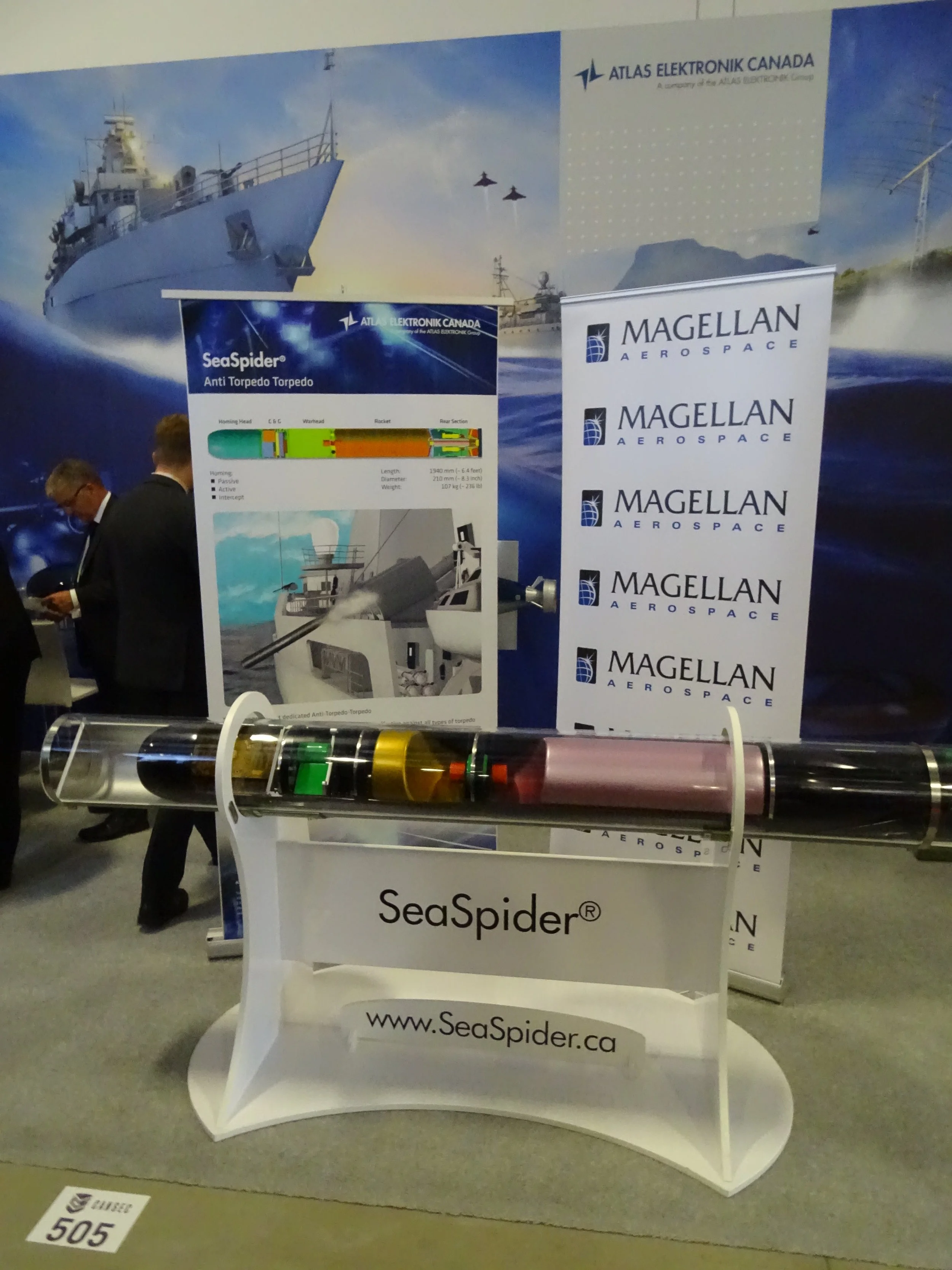 It was announced at the CANSEC show that Atlas Elektronik would be partnering with Magellan Aerospace to develop the SeaSpider anti-torpedo torpedo. The basic concept is that, if a conventional torpedo threat is detected, a warship will fire the SeaSpider torpedo to deliver a “hard-kill” solution. This means that the SeaSpider will use its superior speed to engage and destroy the threat. Magellan will be taking the lead on the underwater rocket propulsion of the SeaSpider.
