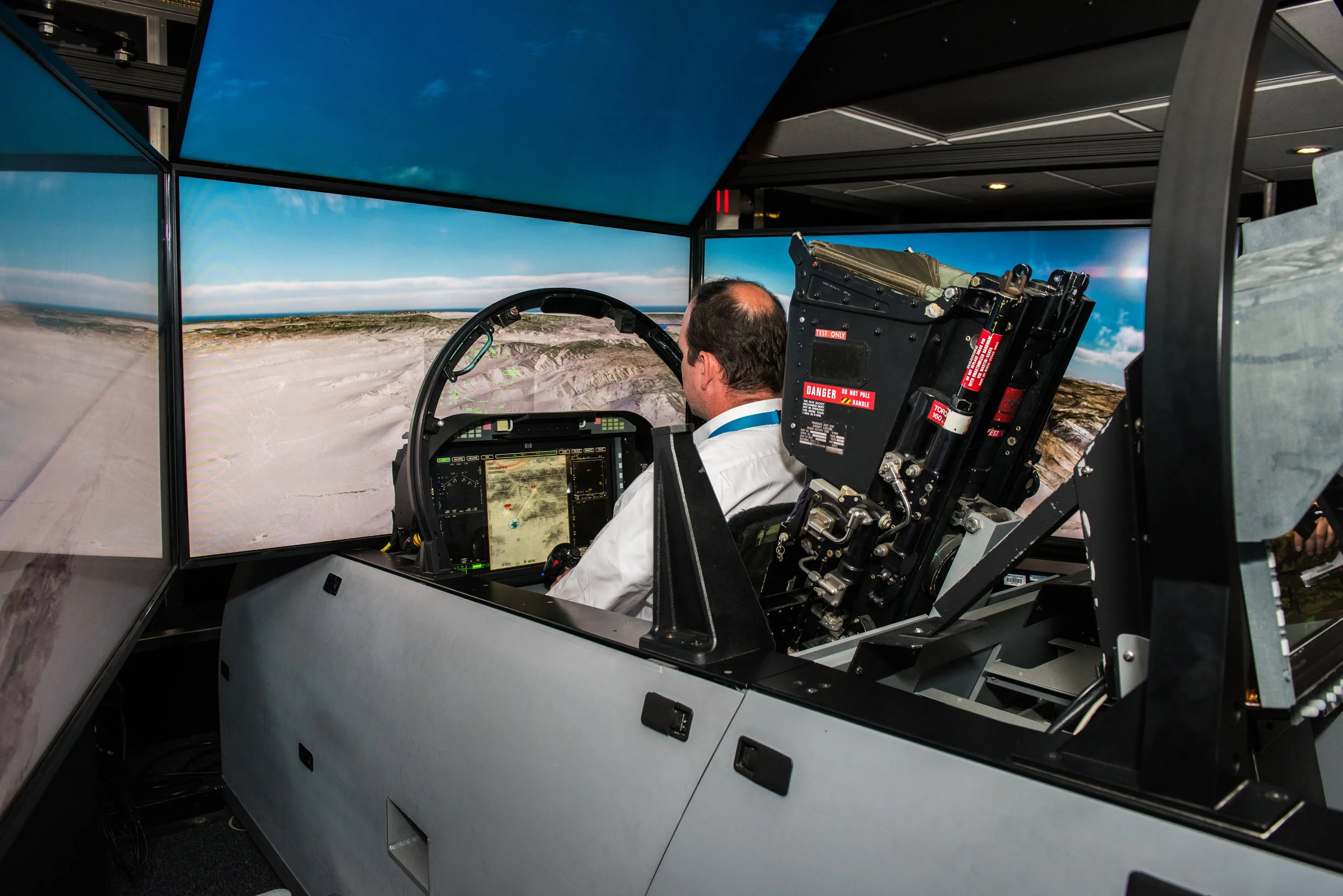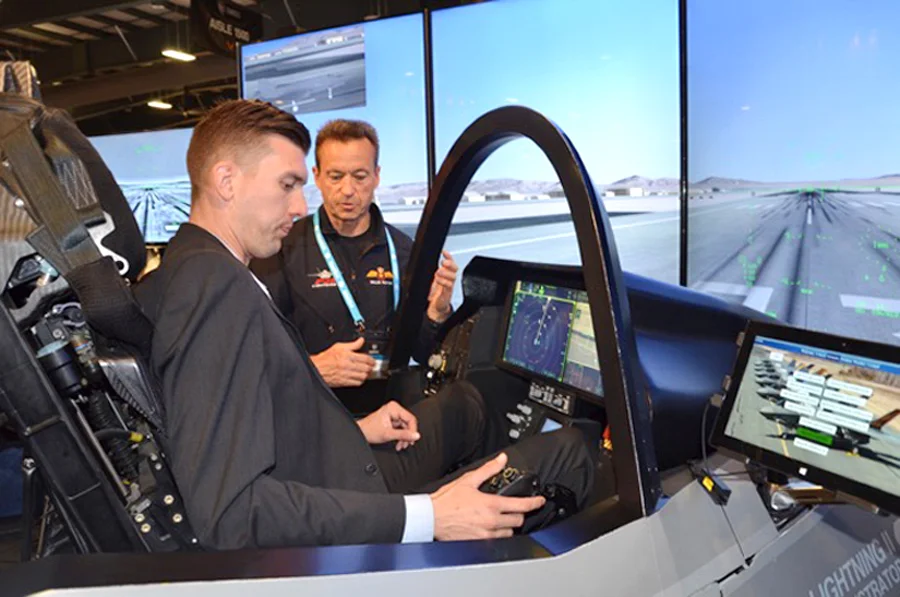 Test pilot Billie Flynn worked tirelessly for two solid days using the LMCO flight simulator to demonstrate to non-pilots just how capable the F-35 Joint Strike Fighter really is. Esprit de Corps’ own Adam Peace – all 6’7” of him, strapped into the cockpit and soared into the blue skies of the simulator monitor to shoot down the bad guys. Mission accomplished.