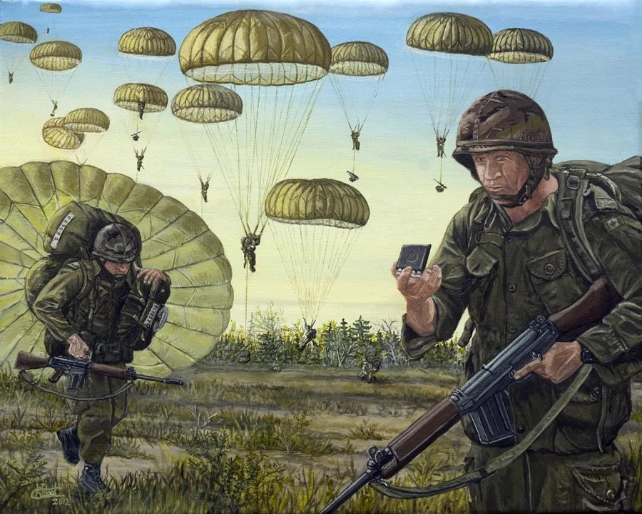 Sgt (Retd) Chabot joined the infantry with the R22eR in 1984 and was posted to the Canadian Airborne Regiment in 1985. Parachutes were a common theme in his early works, mostly due to his experience with the Airborne, and these paintings drew immediate interest among his coworkers. “Military members are passionate about their work. I could have painted anything and if I put a parachute on it, then it would sell,” he said of his early paintings.