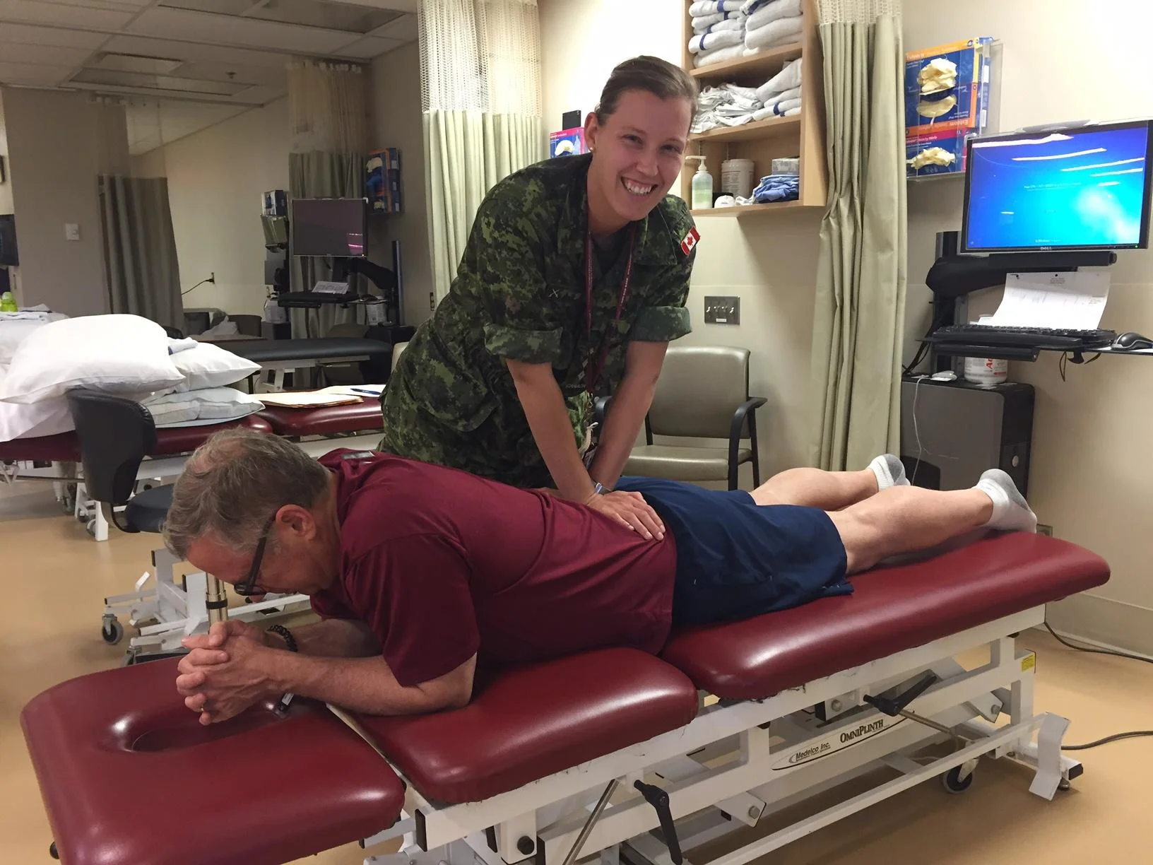 “Ottawa is a little bit different because it’s less physically active and the majority of personnel are more towards the end of their careers,” she explained. “So Ottawa members develop things that are more what we would call degenerative conditions or repetitive stress injuries, such as tennis elbow from not using a mouse properly, or neck strains from having the neck turned all the time to hold the phone. Long-term military careers can also result in diseases like low back pain or knee problems.”