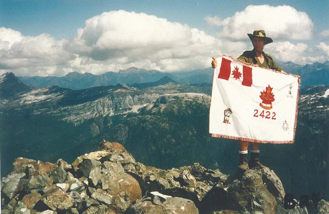 Andrew McBride holding the 2422 Royal Canadian Army Cadets banner atop the Golden Hinde, the highest peak on Vancouver Island, in September 1994.