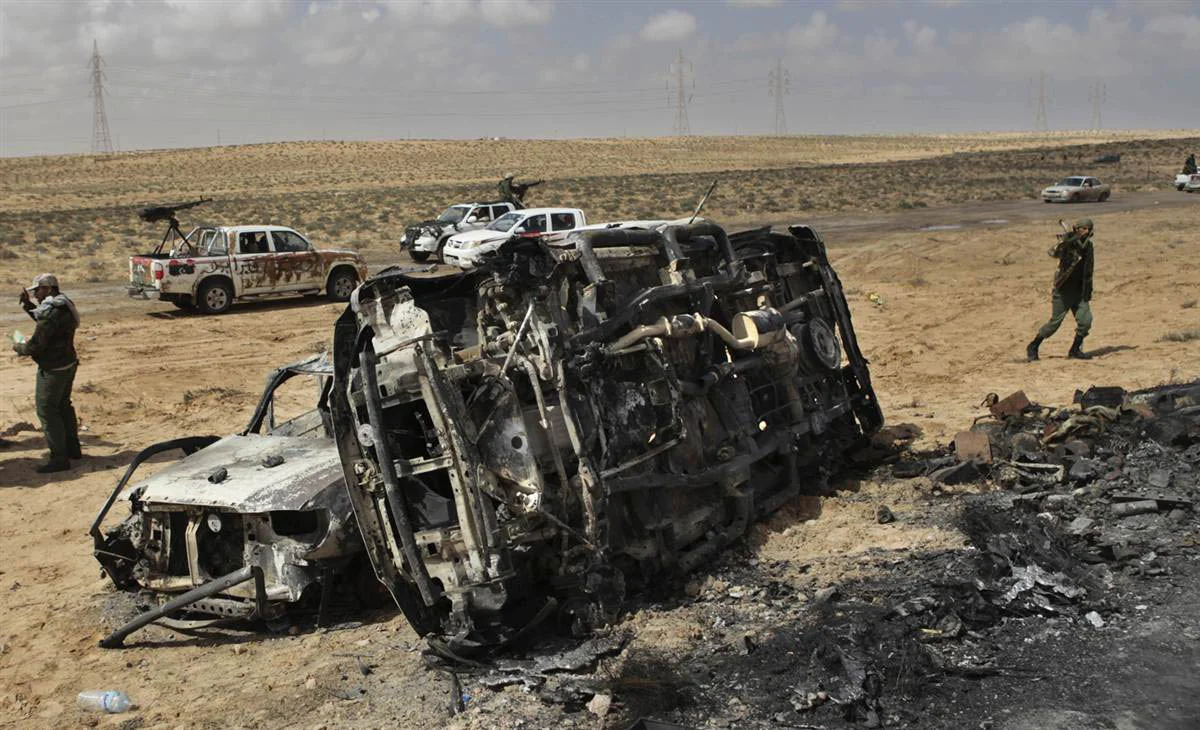 A Libyan rebel walks on past the charred remains of vehicles that were hit by NATO airstrike near Brega.