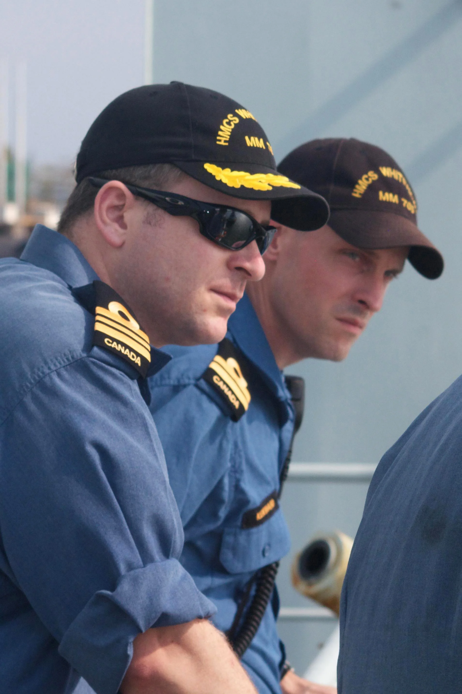 LCdr Christopher Rochon (left) oversees the line handling during an alongside, with the ship’s XO, Lt Lucas Kenward, at Puerto Quetzal, Guatemala, on March 16, 2015. (MS. William Dennis, DND)