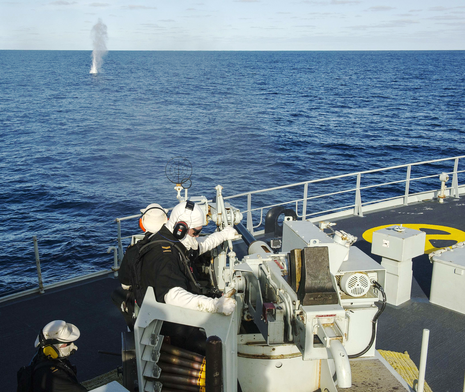 Crewmembers from HMCS Whitehorse conduct weapons maintenance on the 40mm gun while patrolling the Eastern Pacific on Operation CARIBBE. To date this year, the Royal Canadian Navy has assisted in the interception of more than 8,000 kilograms of cocaine while patrolling the Eastern Pacific and Caribbean Sea. (DND)