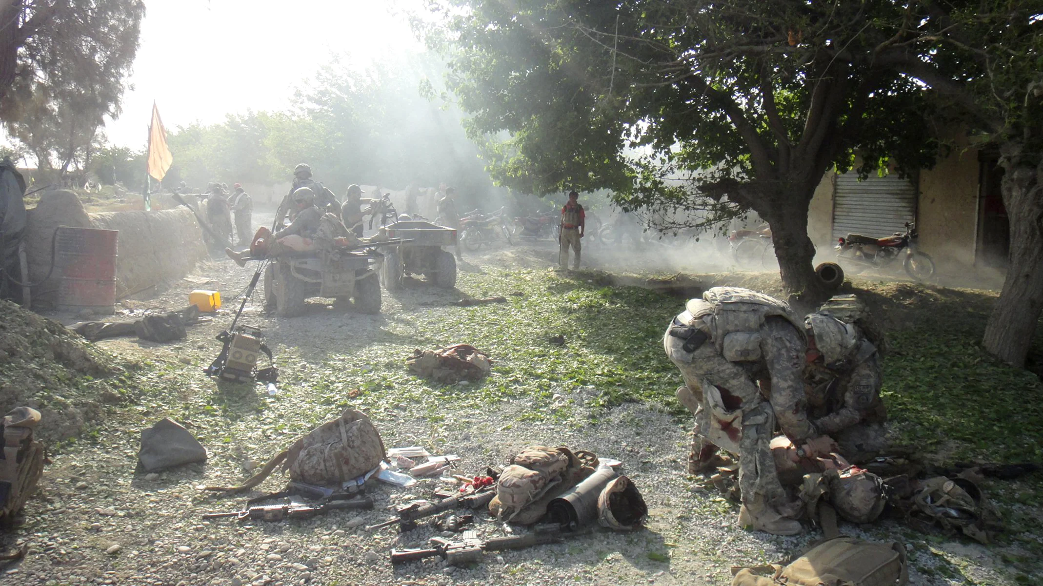 The detachment kept fully busy going out on patrols every day, disrupting the insurgents’ sense of security and carrying out specially designed PSYOPS projects. One of the more successful of these was the Radio Literacy Program where they dropped off hand-crank radios by which villagers could listen to programs designed to help them learn to read. For Franck, the patrol on April 12 was pretty routine and had gone well as he had dropped off most of his heavy load of radios and instruction books by the time they were walking back along the main road through Talukan. Everyone in the patrol was relaxed because this part of the village was considered a secure area, protected by ANP (Afghan National Police) checkpoints. As they approached the gate of the base, however, François suddenly found himself flying through the air! The sound of an explosion stunned him. Then he was on the ground with a huge cloud of dust everywhere. His mind took a few seconds to process the situation: “What the hell! OK, something exploded. I must have hit a mine. Oh shit!”