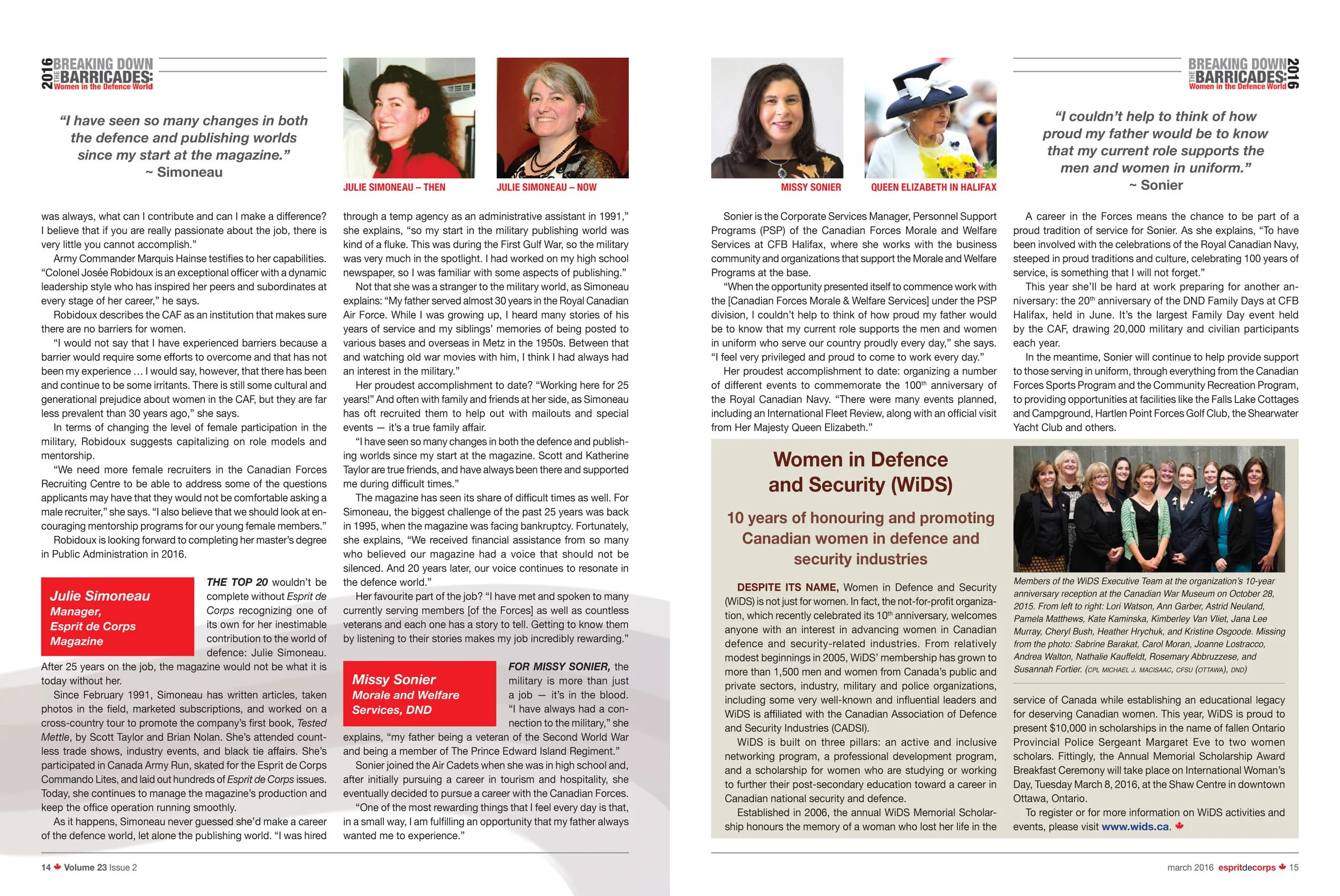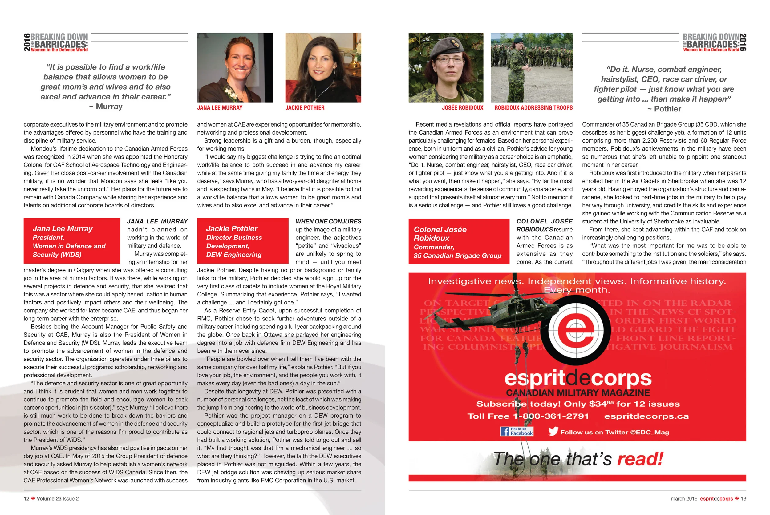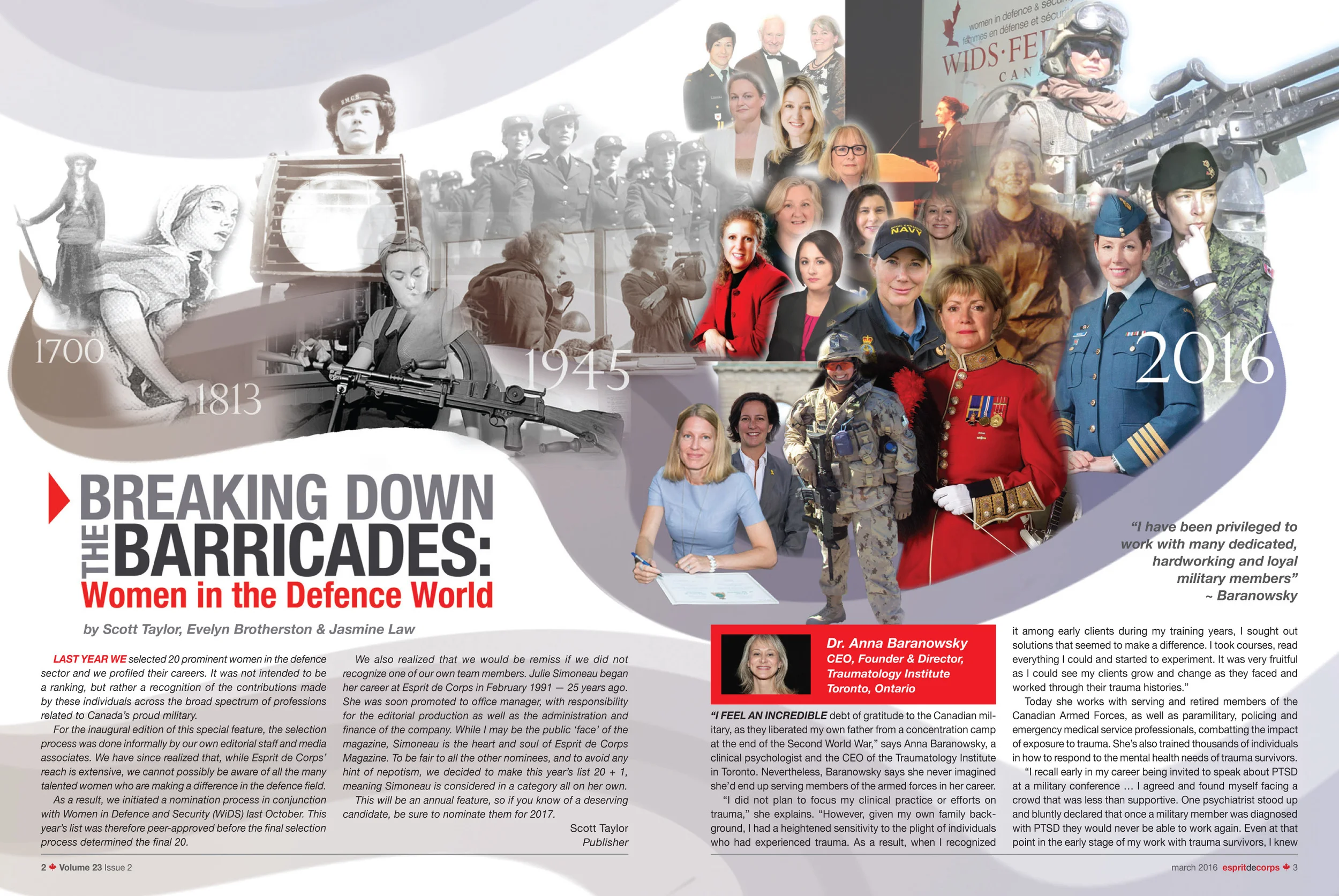 March 2, 2016 Social Media Manager March 2, 2016 Social Media Manager BREAKING DOWN THE BARRICADES 2016 | WOMEN IN THE DEFENCE WORLDBy Scott Taylor, Evelyn Brotherston & Jasmine Law(from the March 2016 issue) View fullsize View fullsize View fullsize View fullsize View fullsize View fullsize View fullsize View fullsize Women in Defence 2017: http://espritdecorps.ca/women-in-defence/breaking-down-the-barricades-women-in-the-defence-worldWomen In Defence 2015: http://espritdecorps.ca/womenindefence/2015/10/28/breaking-down-the-barricades-women-in-defence-2015